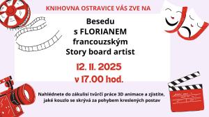 Knihovna Ostravice vás srdečně zve na besedu s FLORIANEM, francouzským Story board artist. Akce se koná 12. listopadu 2025 v 17:00 hodin. Nahlédnete do zákulisí tvůrčí práce 3D animace a zjistíte, jaké kouzlo se skrývá za pohybem kreslených postav.