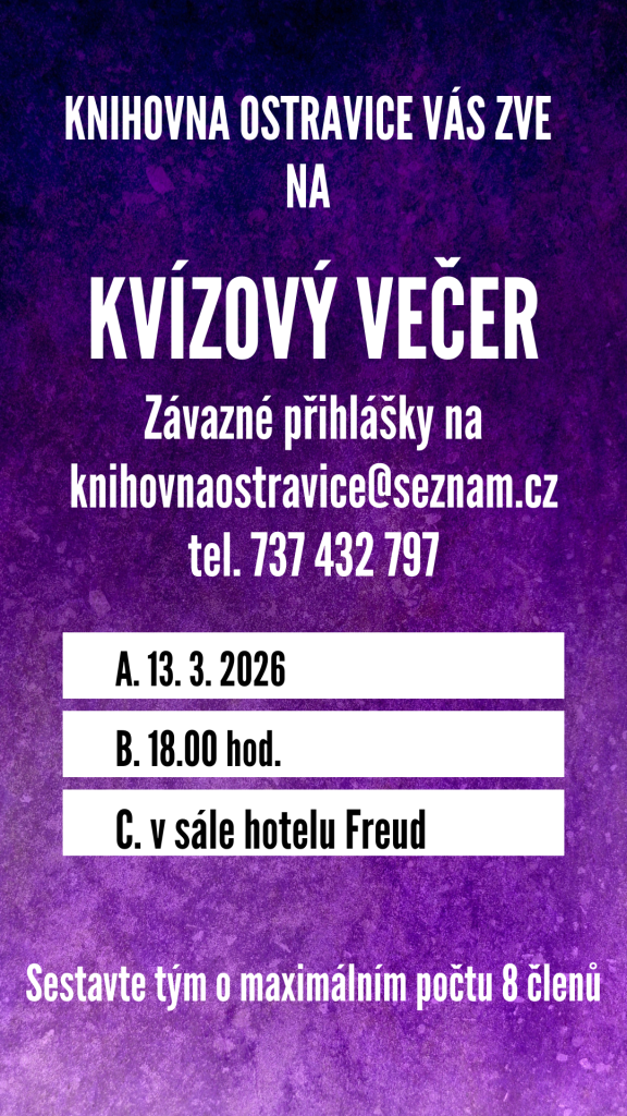 Knihovna Ostravice pořádá kvízový večer, který se koná 13. 3. 2026 od 18:00 v sále hotelu Freud. Přijďte s týmem o maximálním počtu 8 členů a prověřte své znalosti.