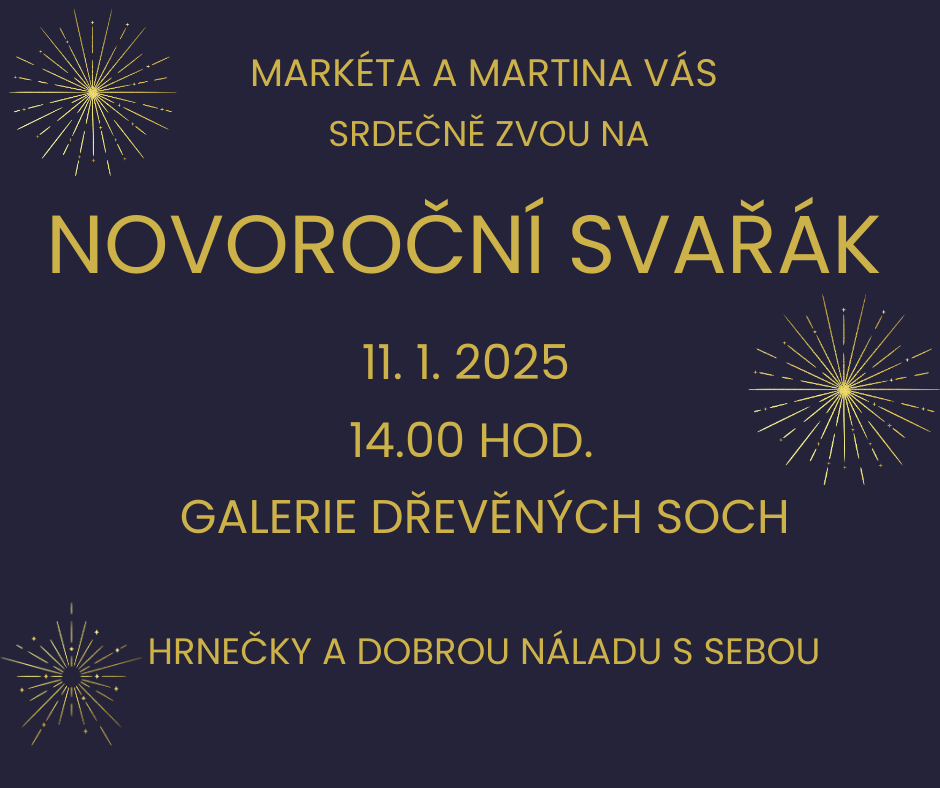 Markéta a Martina srdečně zvou na Novoroční svařák, který se koná 11. ledna 2025 v 14:00 hodin v Galerii dřevěných soch. Přijďte oslavit začátek nového roku v přátelské atmosféře a nezapomeňte si přinést vlastní hrneček a dobrou náladu.