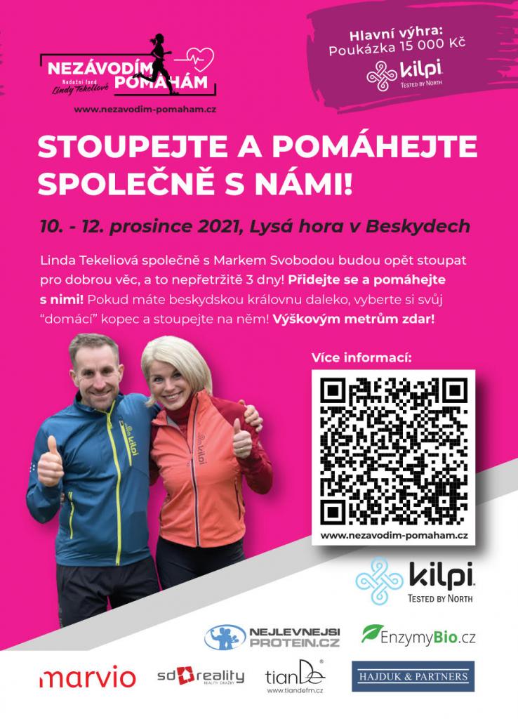 Linda s Markem stráví celé 3 dny (od 10.12. do 12.12.2021) na Lysé hoře v Beskydech. Během těchto tří dnů budou stoupat k vrcholu Lysé hory, sbíhat dolů a takto sbírat výškové metry. Tyto metry pak chtějí s Vaší pomocí proměnit na peníze, které budou věnovány dětem pro zlepšení kvality jejich života. Za získané peníze jim budou uhrazeny rehabilitační aktivity a pohybové a rehabilitační pomůcky.