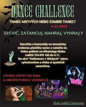 Klub rodičů Ostravice vyzývá všechny k účasti v taneční soutěži na téma Halloween. Přihlaste se, nacvičte s kamarády tanec na tematicky zvolenou písničku a natočte video, které pošlete na WhatsApp do 4. listopadu 2025. Na akci 'Halloween v Nikdyvíc' proběhne vyhodnocení a společné tancování.