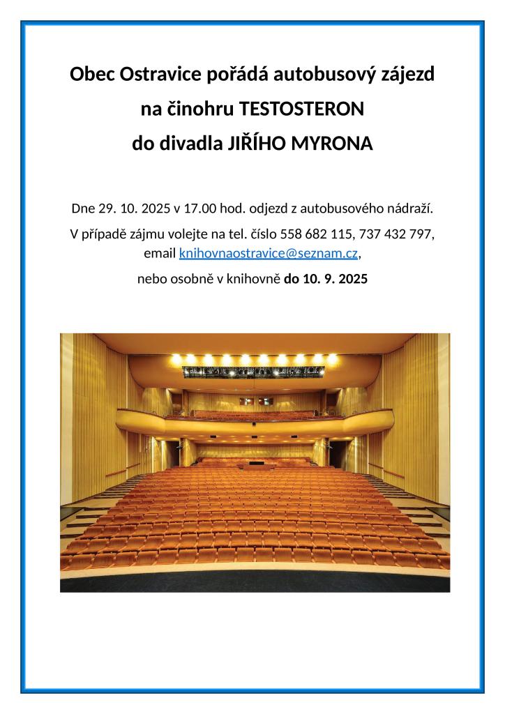Obec Ostravice pořádá autobusový zájezd na činohru TESTOSTERON, která se koná 29. října 2025 od 17:00 hodin v divadle Jiřího Myrona. Odjezd bude z autobusového nádraží. Zájemci se mohou hlásit do 10. září 2025 telefonicky, e-mailem nebo osobně v knihovně.