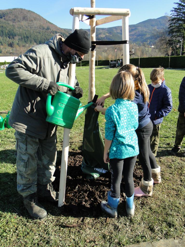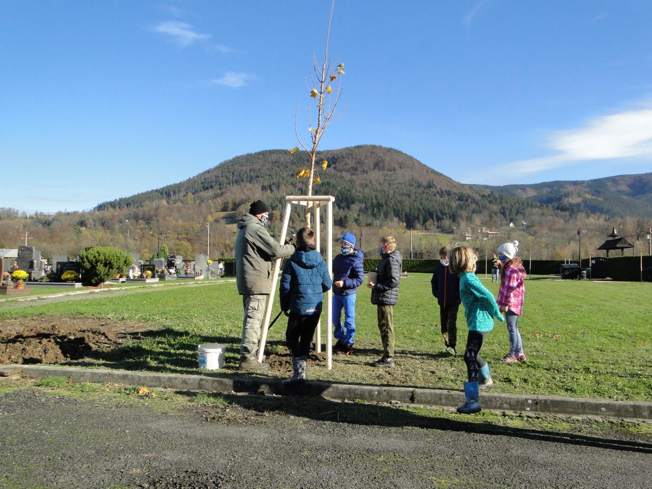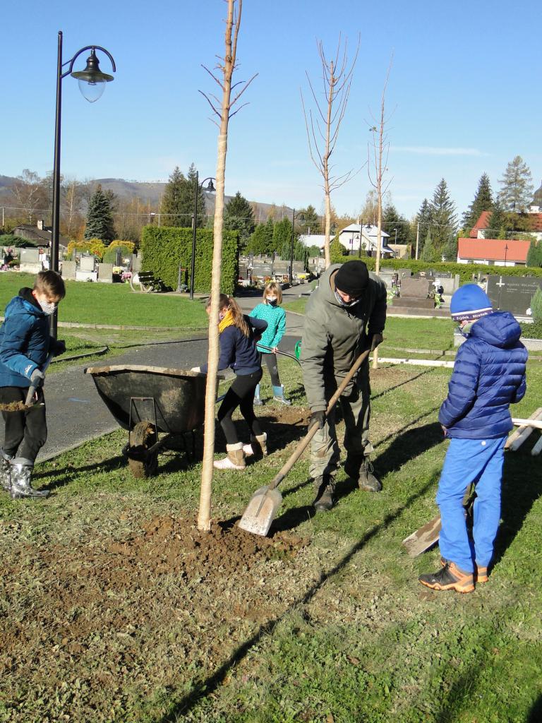 Výsadba okrasných stromků na hřbitově v Ostravici
