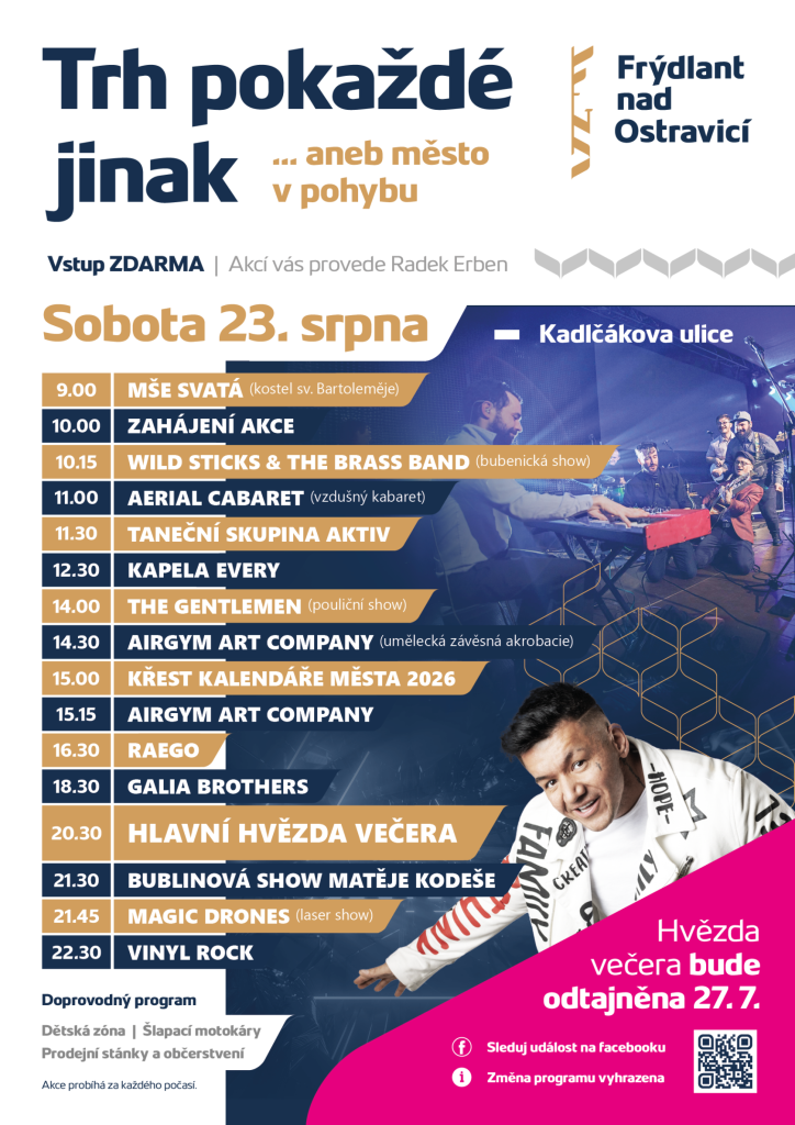 Dovolte nám pozvat Vás na akci „Trh pokaždé jinak... aneb město v pohybu“, která se uskuteční v sobotu 23. srpna 2025 ve Frýdlantu nad Ostravicí.