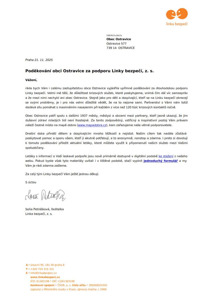 Poděkování obci Ostravici za podporu Linky bezpečí, z. s.
