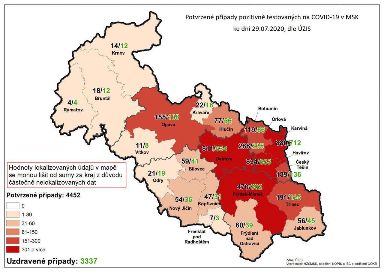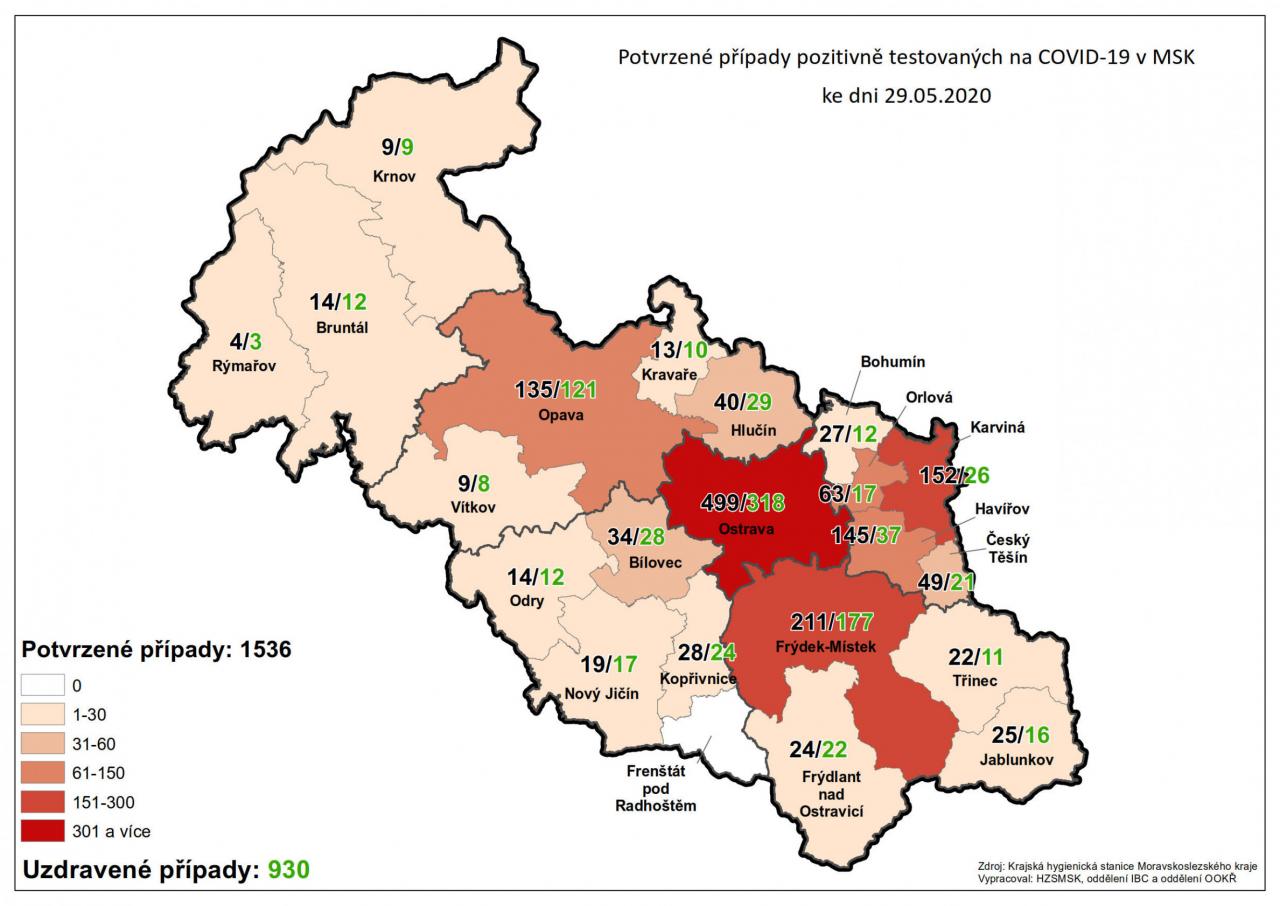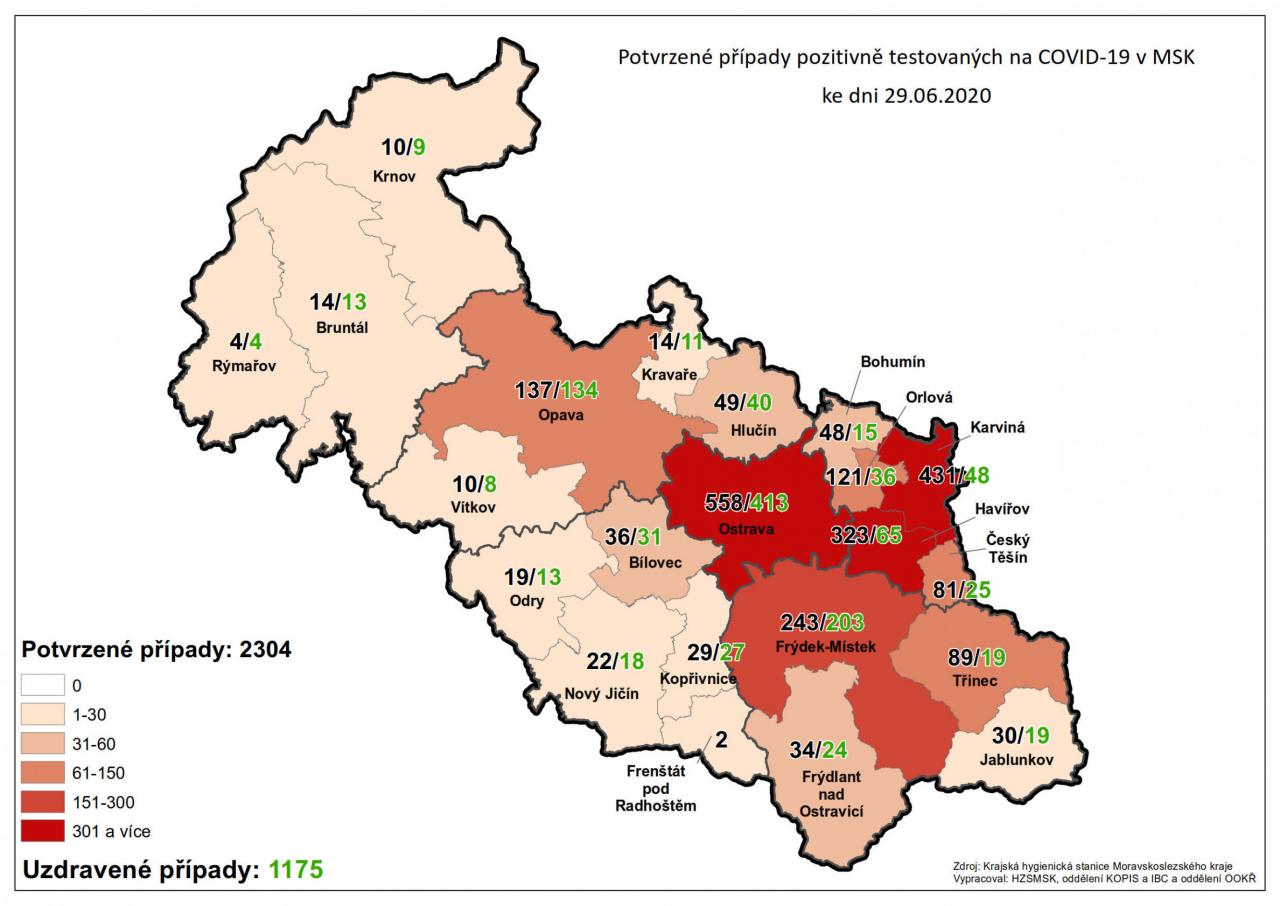 Potvrzené případy testovaných na COVID-19 v MSK 29