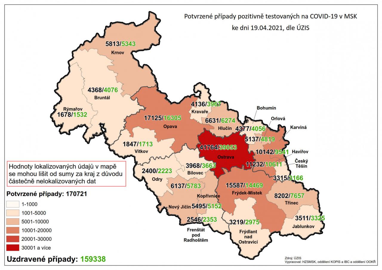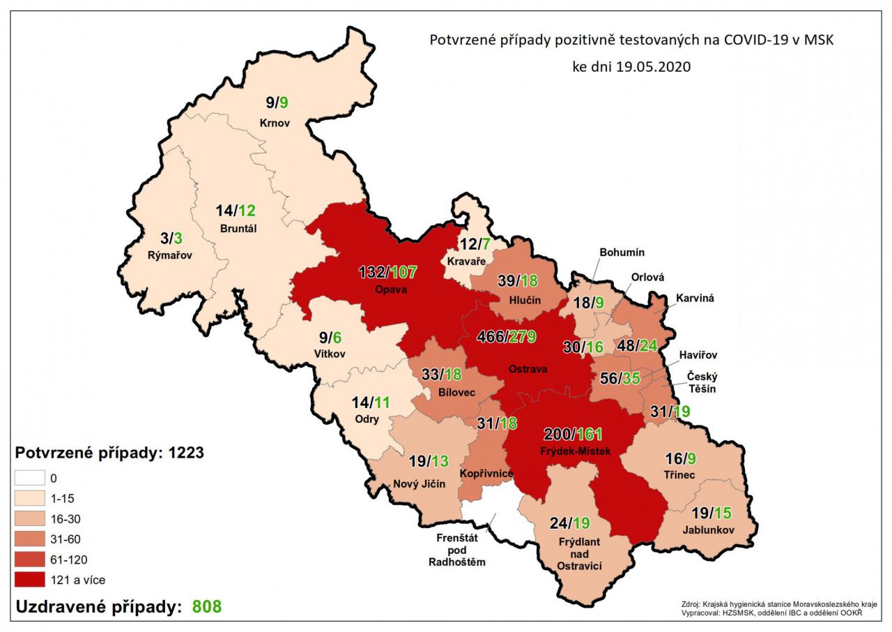 Potvrzené případy testovaných na COVID-19 v MSK 19