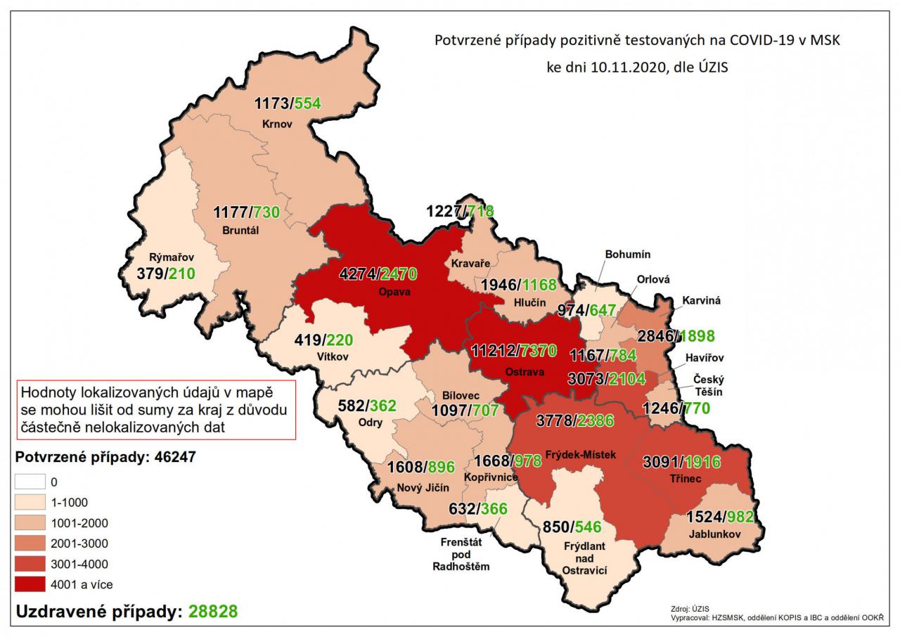 Potvrzené případy testovaných na COVID-19 v MSK 46