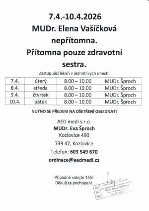 V týdnu od 7. do 10. dubna 2026 bude MUDr. Elena Vašíčková nepřítomna. Během této doby bude ordinaci zastupovat MUDr. Eva Šproch, a to od úterý do pátku, vždy od 8.00 do 10.00. Je nutné se předem objednat na ošetření. Pro další informace kontaktujte prosím ordinaci AED medi s.r.o.
