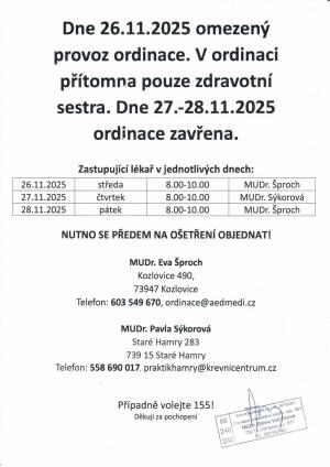 Dne 12. a 13. listopadu 2025 bude ordinace omezená. V těchto dnech bude přítomna pouze zdravotní sestra.