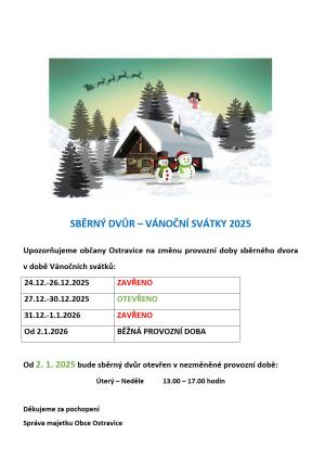 Oznamujeme občanům Ostravice změnu provozní doby sběrného dvora během Vánočních svátků. Sběrný dvůr bude zavřený ve dnech 24. – 26. prosince, 31. prosince a 1. ledna.