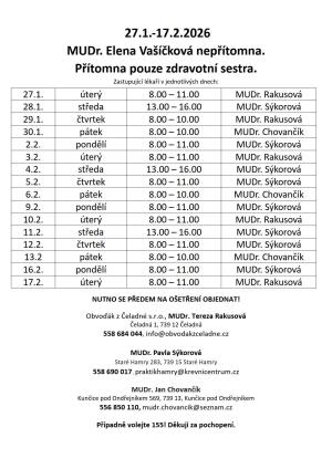 MUDr. Elena Vašíčková nebude k dispozici od 27. ledna do 17. února 2026.