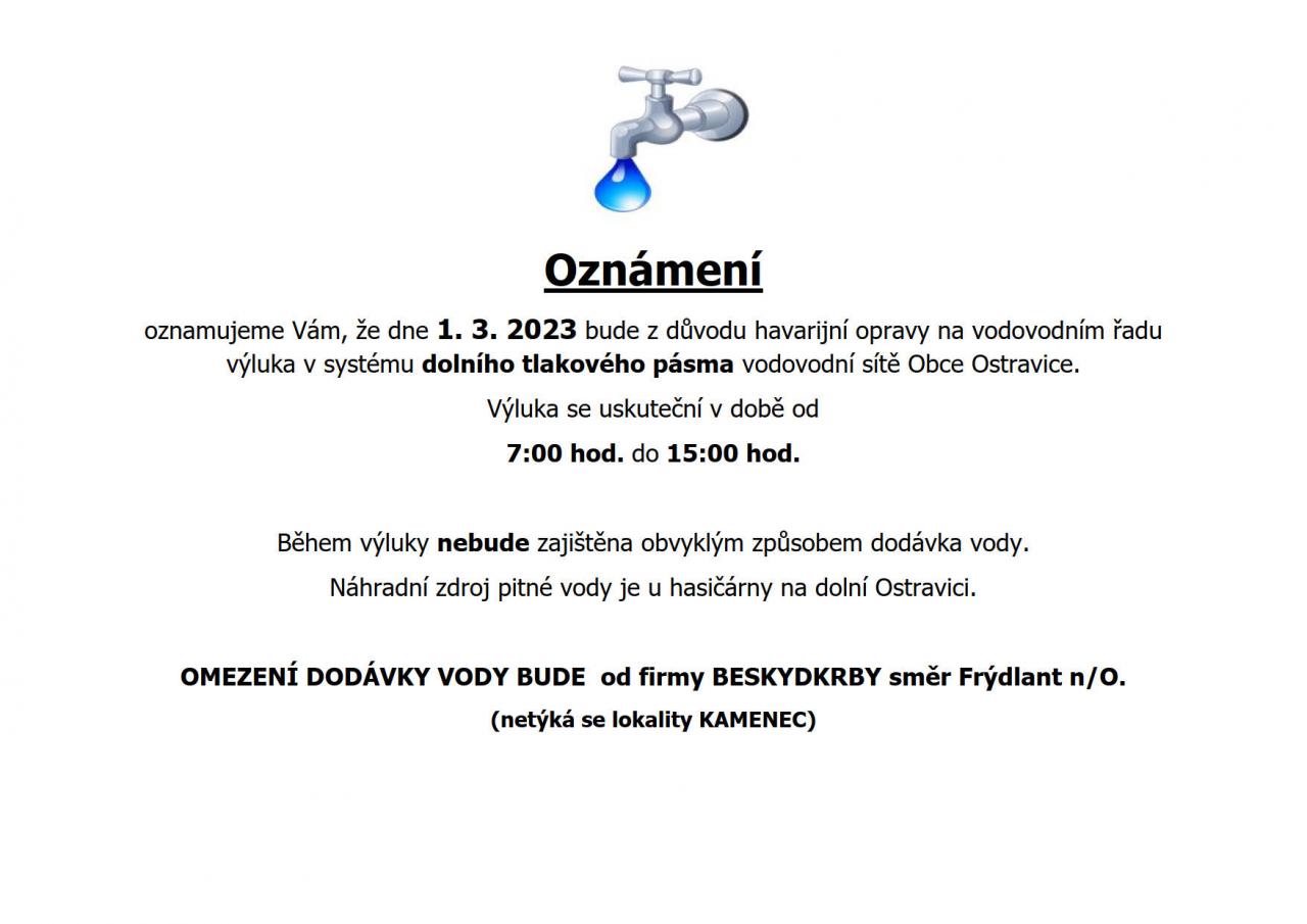 oznamujeme Vám, že dne 1. 3. 2023 bude z důvodu havarijní opravy na vodovodním řadu výluka v systému dolního tlakového pásma vodovodní sítě Obce Ostravice.
