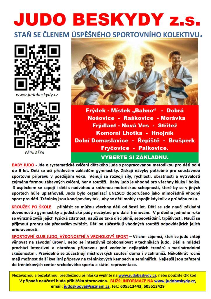 Sportovní klub JUDO BESKYDY z.s. zve děti k připojení se k jejich sportovnímu kolektivu. Program Baby Judo je určen pro děti od 4 do 6 let a zaměřuje se na rozvoj gymnastických dovedností a základů juda. Děti se učí nejen pohybovým schopnostem, ale také důležitým hodnotám jako je disciplína a týmová spolupráce. Kroužek je otevřen pro všechny děti od šesti let a zahrnuje soutěže odpovídající jejich úrovni. Všichni zájemci o závodní judo mají možnost zúčastnit se intenzivního trénování pod vedením zkušených trenérů.