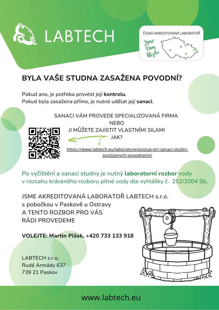 Akreditovaná laboratoř Labtech se sídlem v Paskově u Ostravy nabízí rozbor pitné vody ze studny pro zjištění její kvality.