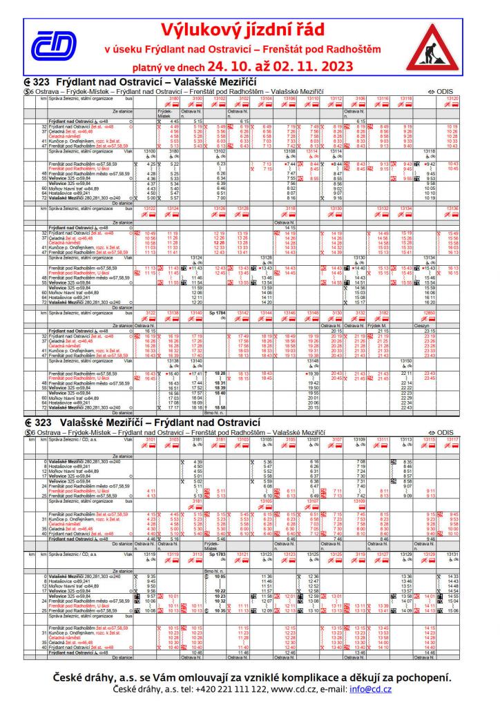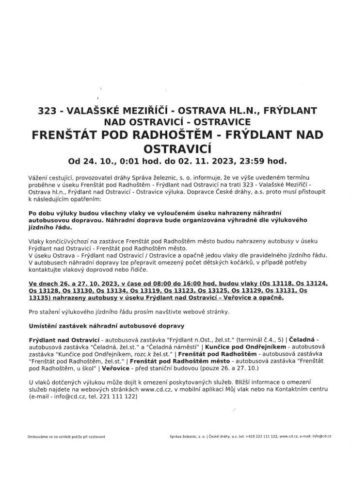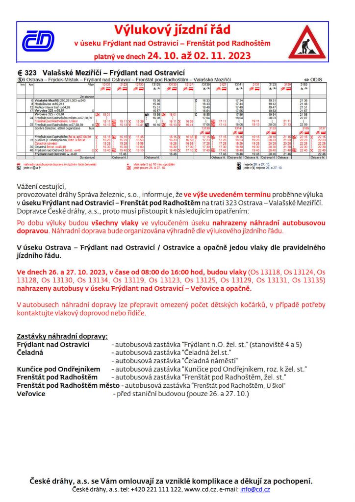 Ve dnech 26. a 27. 10. v době od 8 do 16 hodin je výluka až do Veřovic.