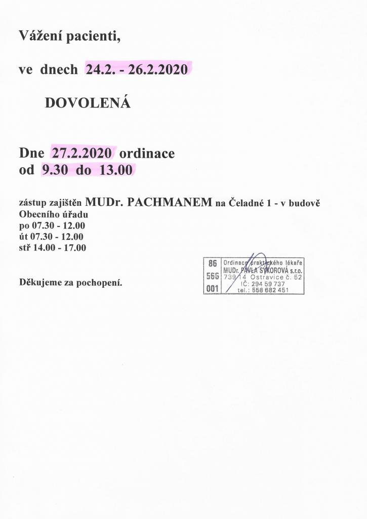 24. 2. – 26. 2. 2020 – DOVOLENÁ 27. 2. 2020 ordinace od 9:30 do 13:00 hod.