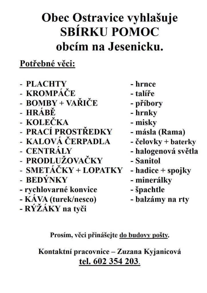 Obec Ostravice vyhlašuje SBÍRKU POMOC