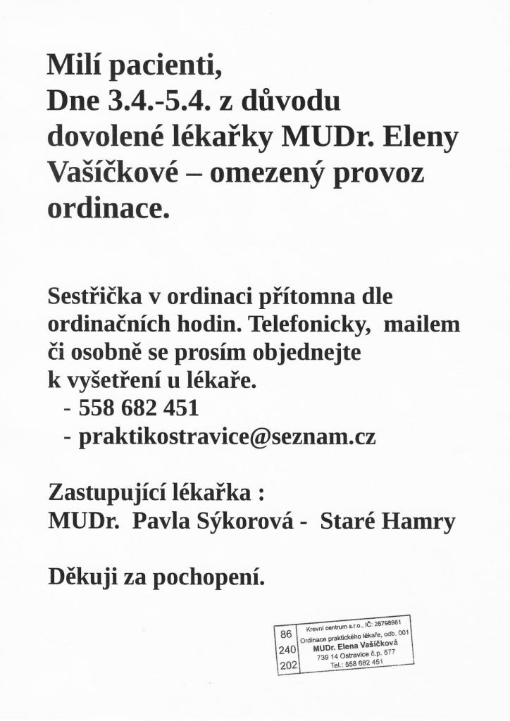 Omezený provoz ordinace 3. – 5. 4. 2023
