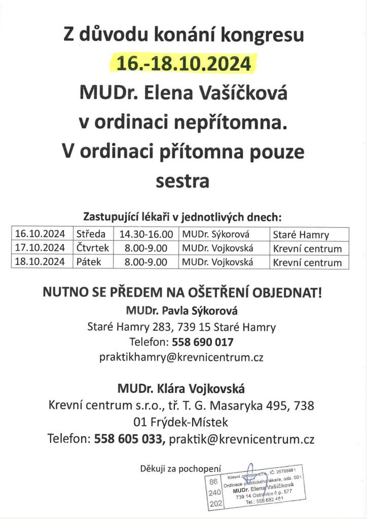 16. – 18. 10. 2024 MUDr. v ordinaci nepřítomna