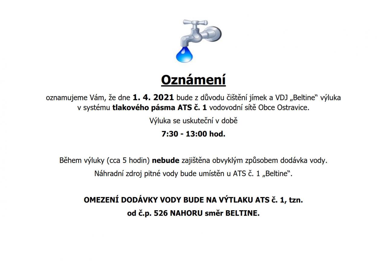 Oznámení – Výluka v systému tlakového pásma ATS č. 1 2