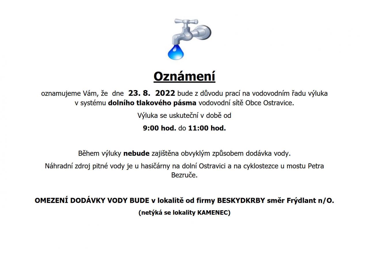 oznamujeme Vám, že  dne  23. 8.  2022 bude z důvodu prací na vodovodním řadu výluka v systému dolního tlakového pásma vodovodní sítě Obce Ostravice.
