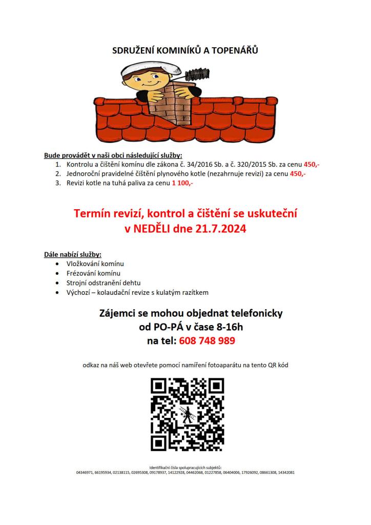 Bude provádět v naší obci v NEDĚLI dne 21.7. požadované kontroly a čištění komínů dle zákonu č. 34/2016 Sb. za 450 Kč, čištění plynových kotlů za 450 Kč a revize kotlů na tuhá paliva za 1 100 Kč. Dále nabízí vložkování a frézování komínů.