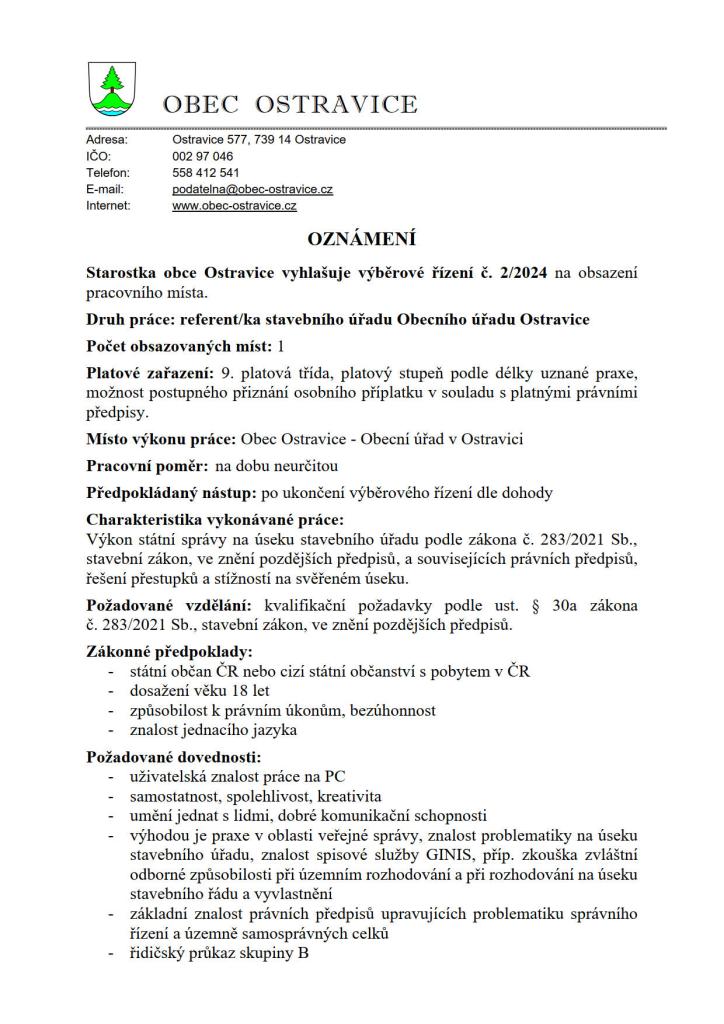 Starostka obce Ostravice vyhlašuje výběrové řízení na obsazení pracovního místa – referent/ka stavebního úřadu  1