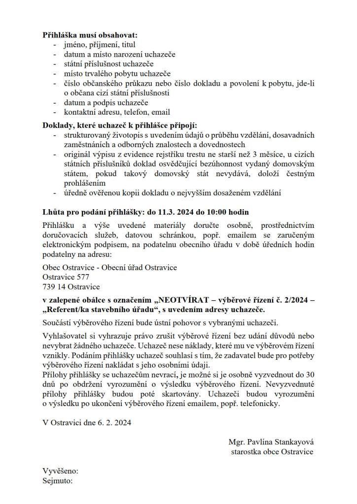 v zalepené obálce s označením „NEOTVÍRAT – výběrové řízení č. 2/2024 – „Referent/ka stavebního úřadu“, s uvedením adresy uchazeče.