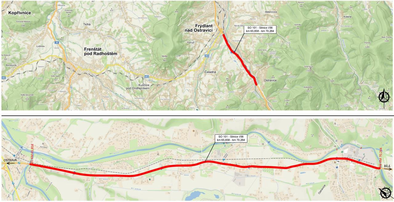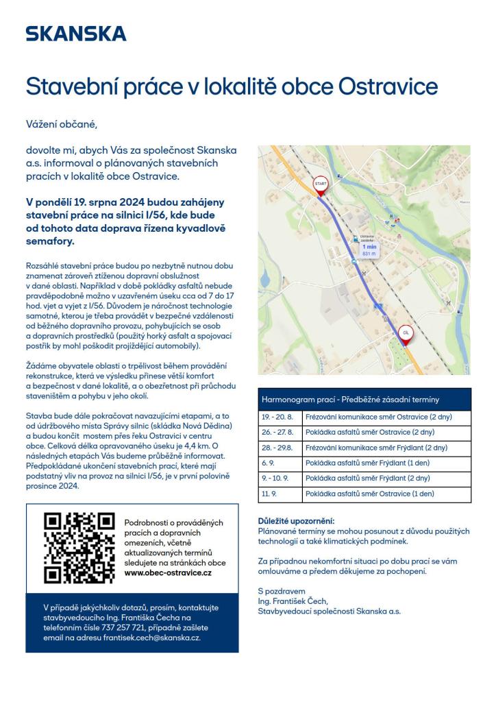 Od pondělí 19. srpna 2024 začíná plánovaná oprava průtahu Ostravicí. Silnice I/56 v km 65,858 – 70,264 provozního staničení vykazuje známky vozovkových vad způsobených končící životností asfaltové skladby. Rekonstrukce proběhne rámci rozdělení průtahu na tři dílčí úseky charakteristické rozdílnou technologií opravy odpovídající odlišné skladbě dvoupruhové komunikace o šířce sedmi metrů.