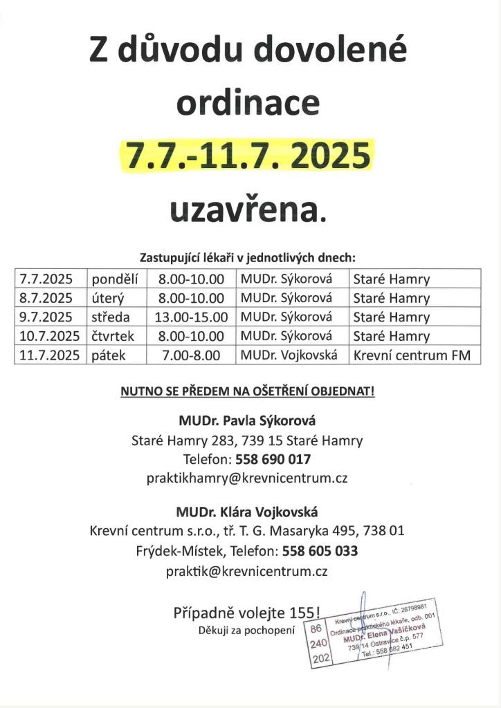 Vzhledem k dovolené je ordinace uzavřena od 7. do 11. července 2025. Po tuto dobu budou k dispozici zastupující lékaři, MUDr. Pavla Sýkorová a MUDr. Klára Vojkovská, v určených časových intervalech. Pacienti jsou vyzváni, aby se předem objednali na ošetření, a to telefonicky na uvedených kontaktech.