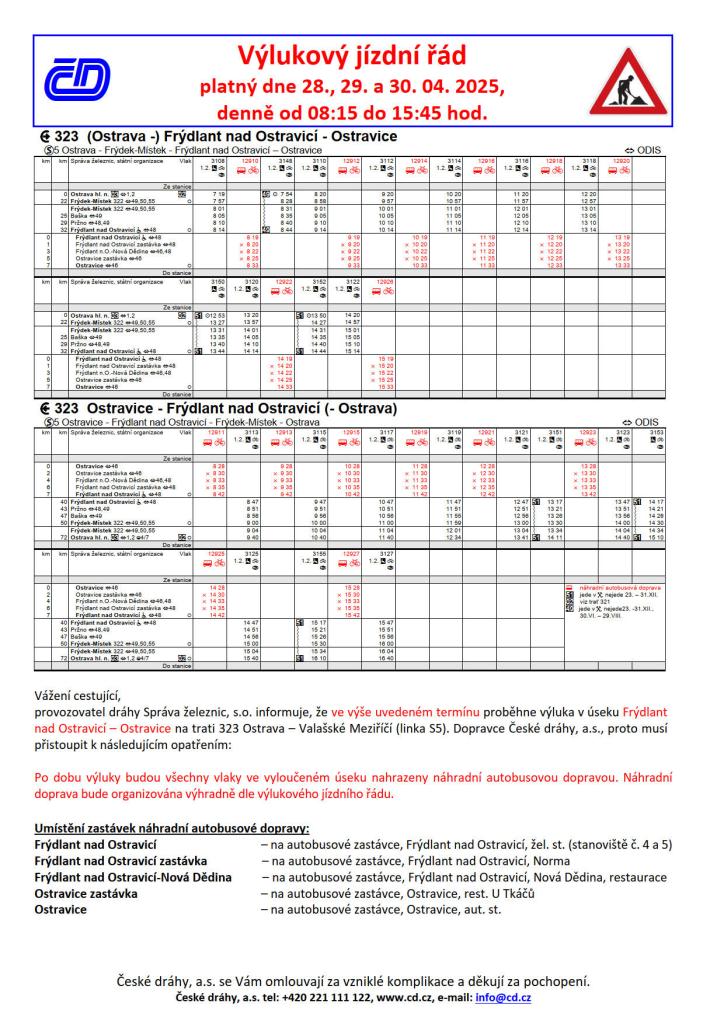 Výlukový jízdní řád na výluku v úseku Frýdlant nad Ostravicí - Ostravice .