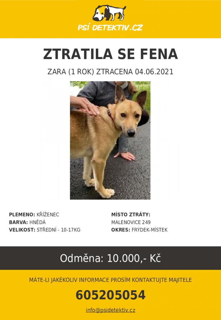 Zara je 1 rok stará fenka. Má oranžový obojek a oranžový postroj, je i čipovaná. Je kastrovaná a váží cca 10 kg. Ztratila se okolo 14. hodiny cestou na Lysou Horu, zaběhla se v půlce cesty směrem od hotelu Bezruč.